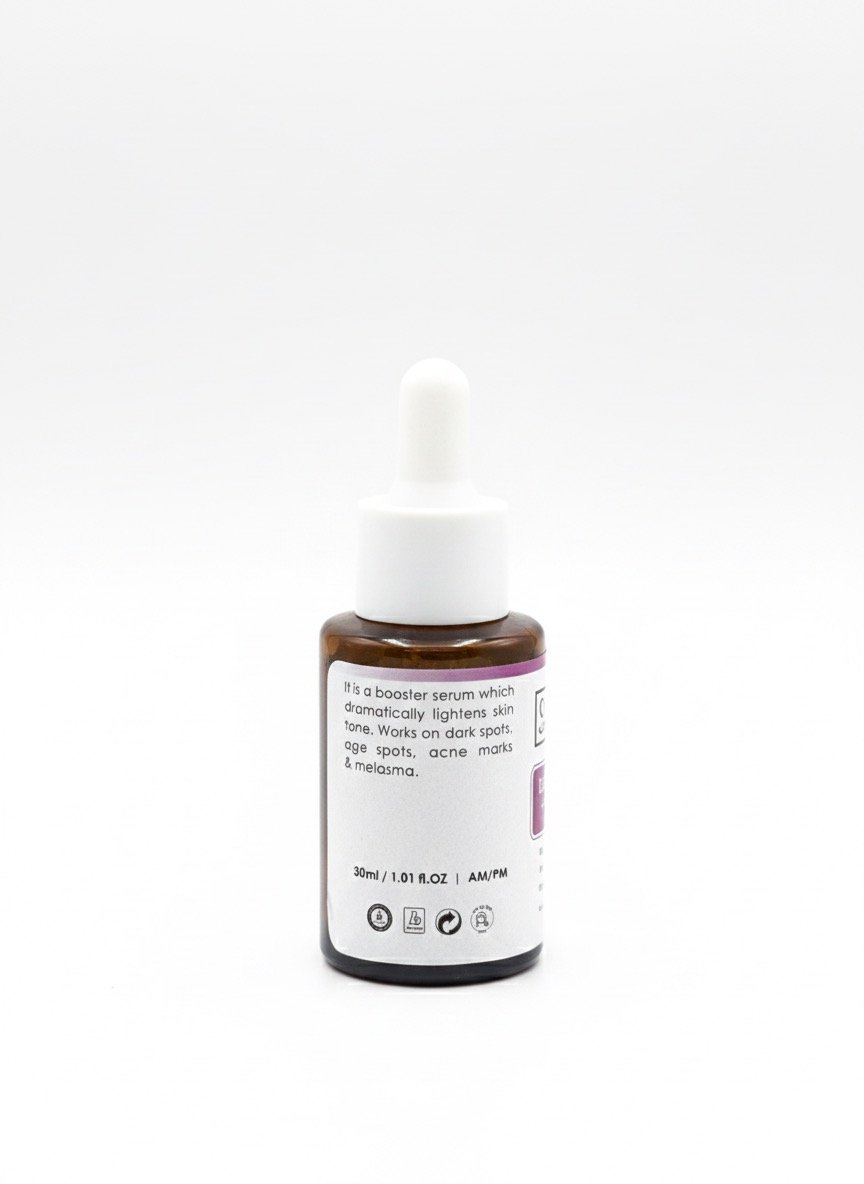It is a booster serum which dramatically lightens skin tone. Works on dark sports, age sport, acne marks, Melasma, Hyperpigmentation, and Discoloration.